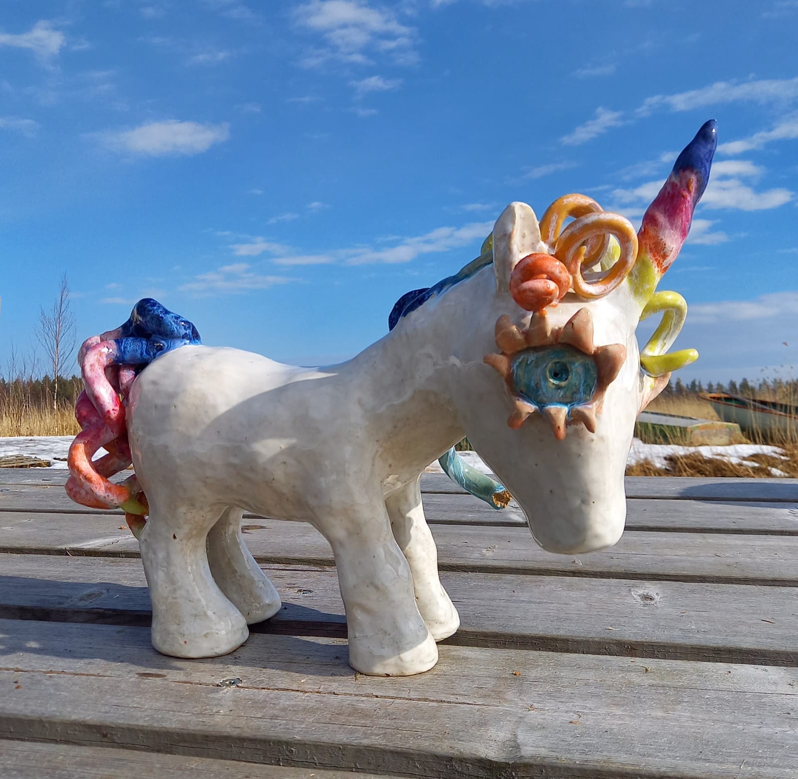 Esittelyssä vaahtokarkkiyksisarvinen. Tämä käsin rakennettu keraaminen yksisarvinen syntyi vuonna 2025.