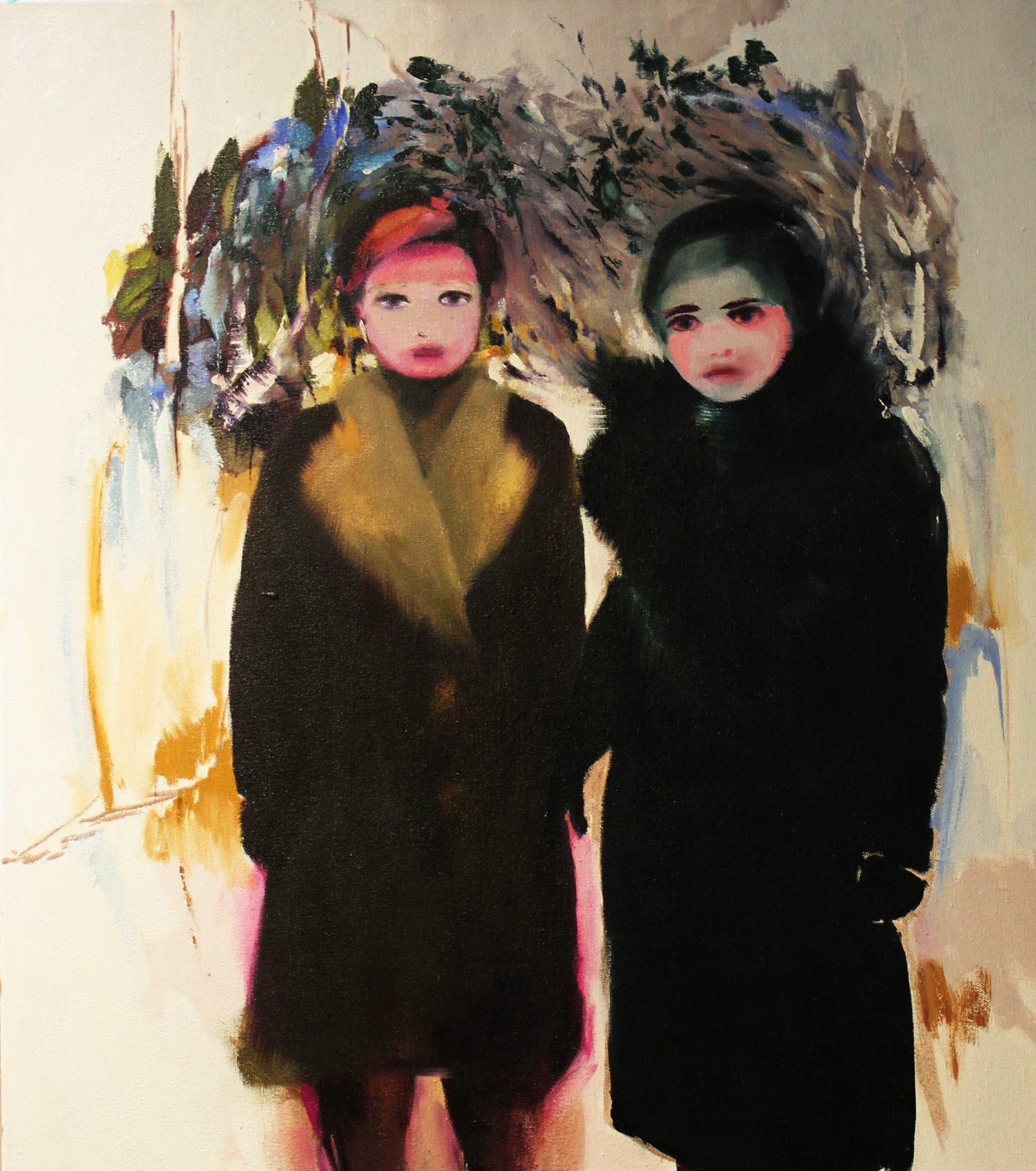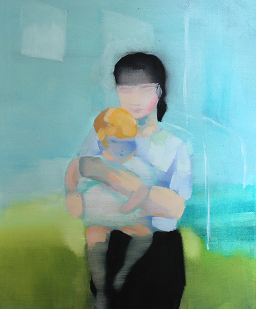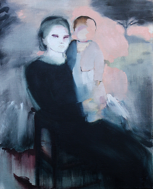 Maalasin useita äiti ja lapsi -maalauksia. Aluksi vain pintoja ja muotoja. Sitten kehoja. Valoisia alueita, tummia nurkkauksia. Monilla kasvoilla hieman tyly sulkeutunut ilme. Katseita, jotka kiertävät toistensa ohi. Läheisyyttä, jota ei ehkä koskaan ollut, mutta jota paljon kaivattiin. Maalasin lapsia jotka oppivat olemaan kilttejä, hiljaa tai näkymättömiä.