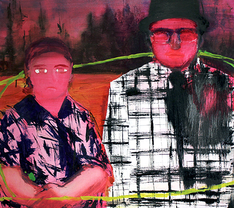 Maalausta on turhaa koittaa selittää liian auki. Vähän kuitenkin tahdon kertoa. Jokaisessa suvussa on tarinoita, joita kerrotaan sekä niitä joista vaietaan. Sota on yksi suuri asia, josta kaikki isovanhempani joutuivat selviytymään. Sota on jättänyt moniin sukuihin väkivallan kierteen, jota ei osattu katkaista. Kun lapsena kysyin ukkini rintapielessä olevista prenikoista, hän sanoi että tappoi paljon ihmisiä. Pappani on puolestaan perheelleen vaiennut sodasta, puhunut siitä vain miesten kesken. Tässä maalauksessa on mummoni ja pappani. Jossain vaiheessa, kun ajattelin teoksen olevan jo olla valmiina se alkoikin vaatia jotain. Maalasin tuon vihreän nauhamaisen viivan, joka sitoo kuvan elementit ja henkilöiden kohtalot yhteen ja antaa myös toivon.